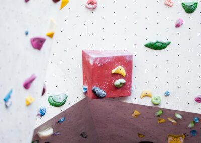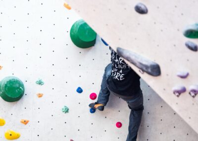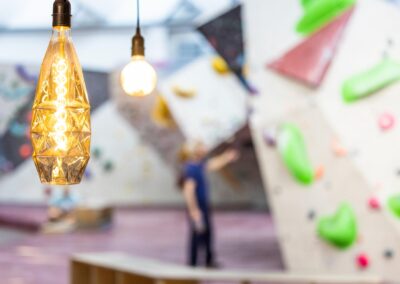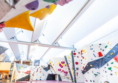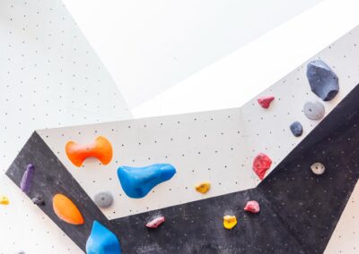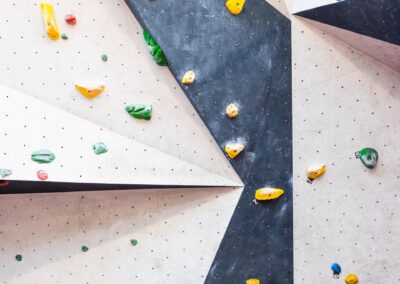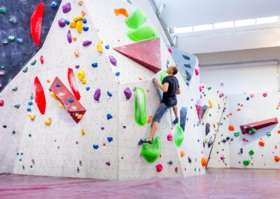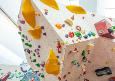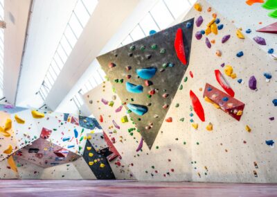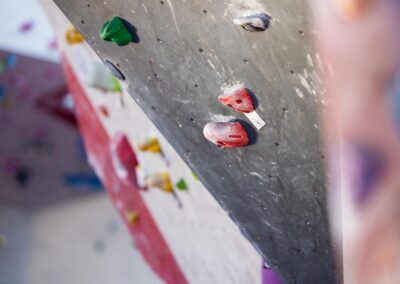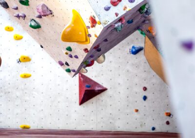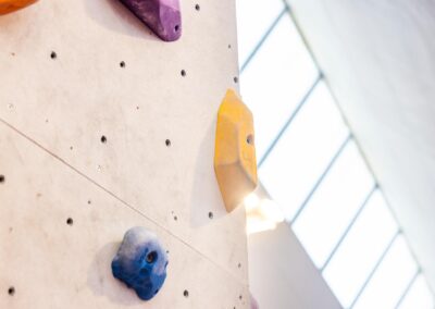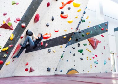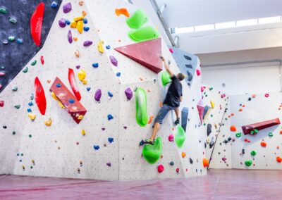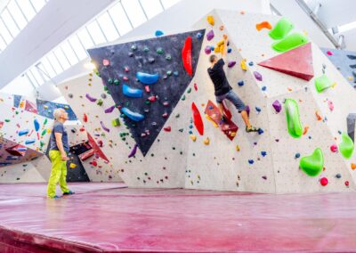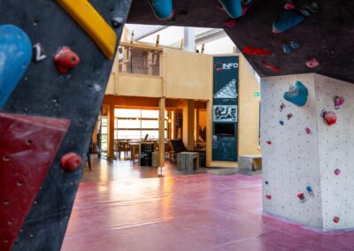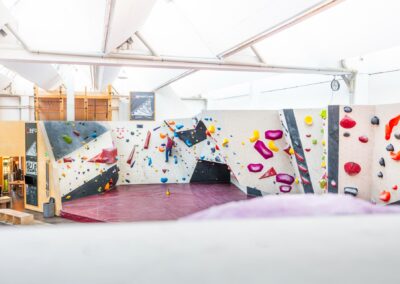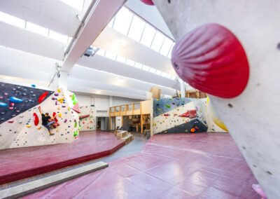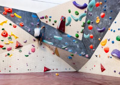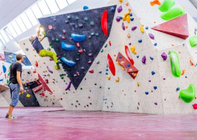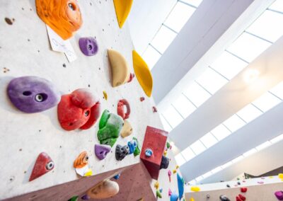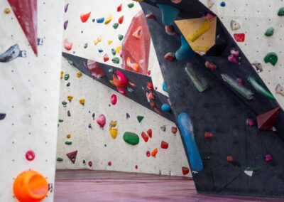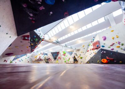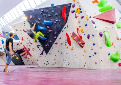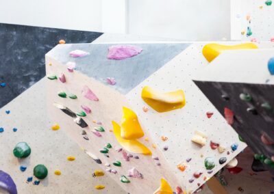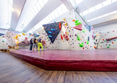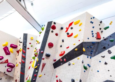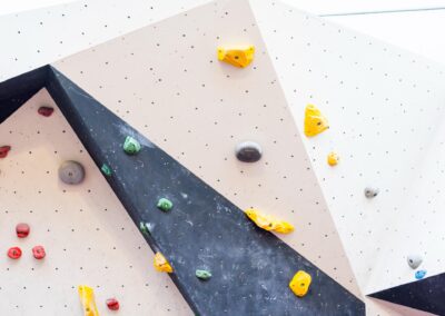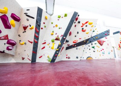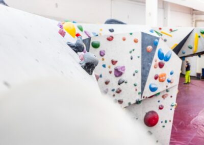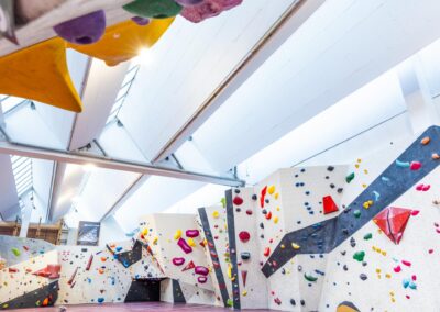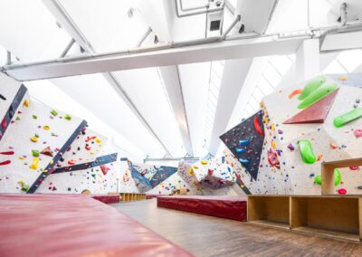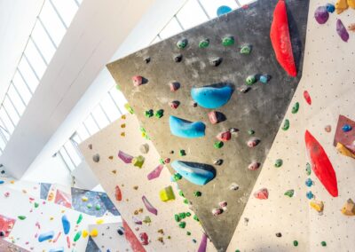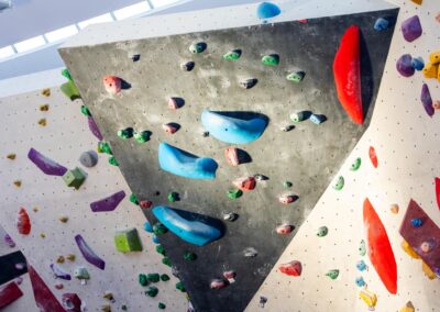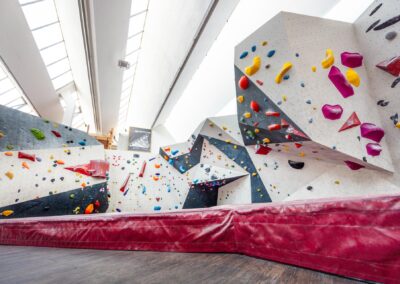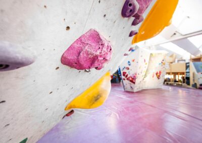 Bei uns findest du alles, was das Bouldern zum Erlebnis macht: Auf mehreren Ebenen erwarten dich abwechslungsreiche Wandhöhen zwischen 3,00 m und 4,50 m. Ob geneigte Platte, senkrechte Wand, sanfter Überhang oder steiles Gelände – bis hin zum beeindruckenden 8 Meter langen Dach des „Diamanten“ ist für jede*n etwas dabei.