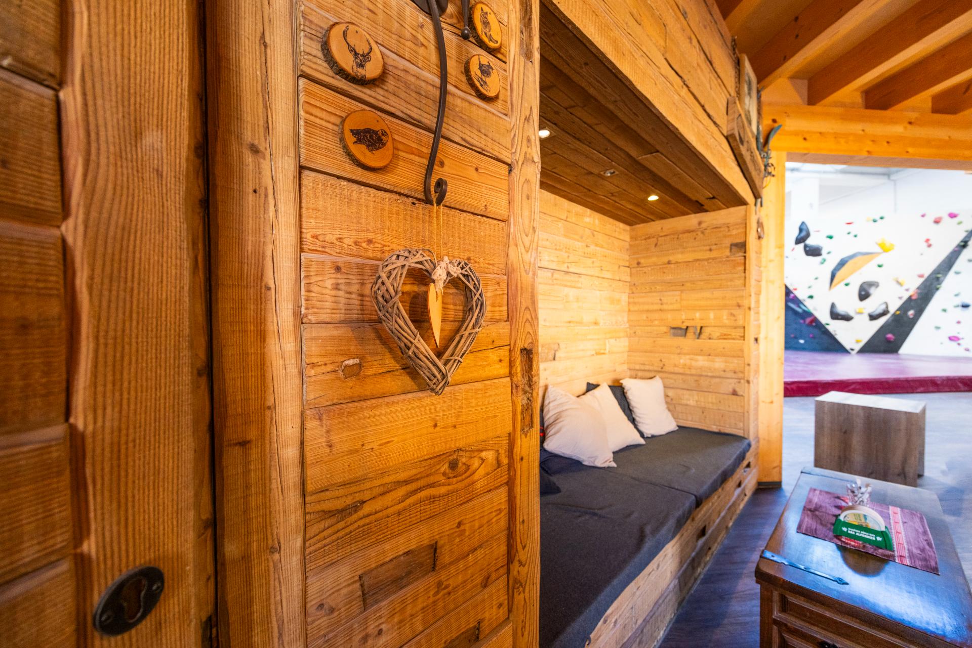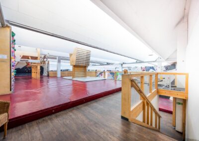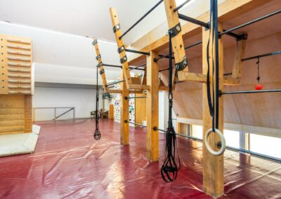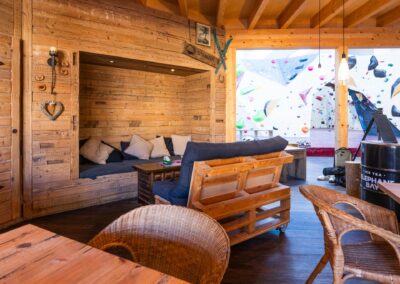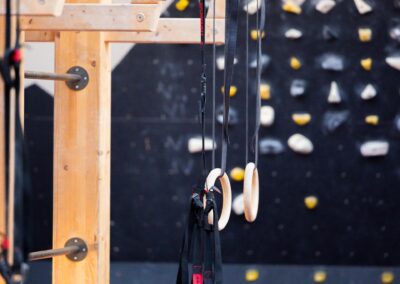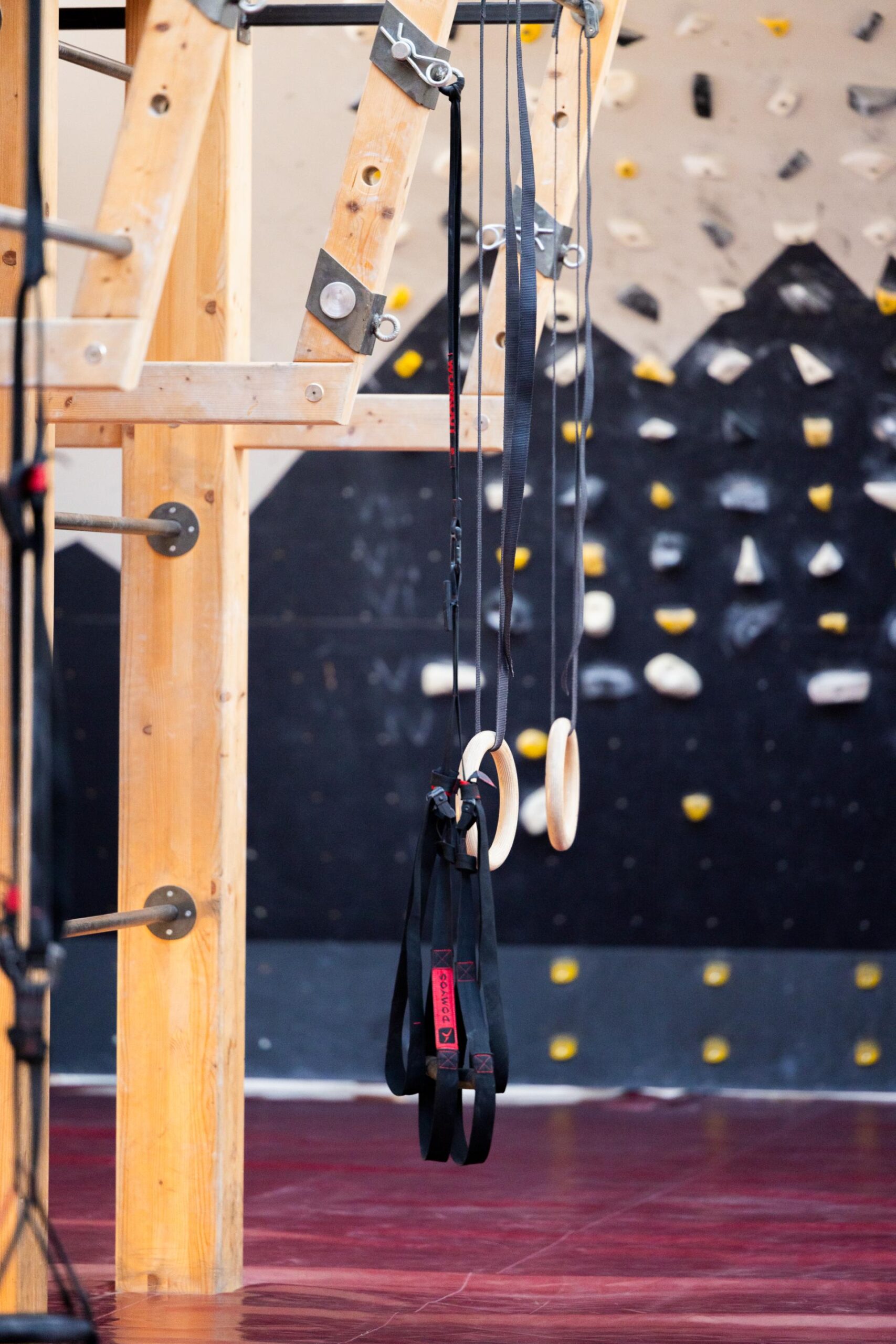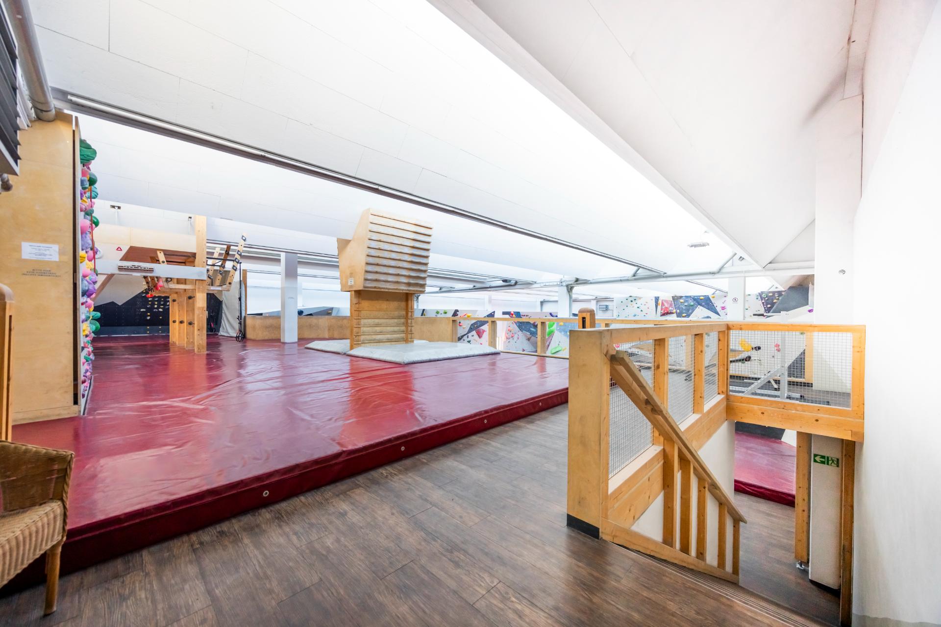 Campusboard, Moonboard, Pegboard, verstellbare Systemwand, Ringe, Powerballs, Reckstangen – perfekt für ambitionierte Boulder*innen. Und das Beste: Die Trainingsfläche liegt auf der zweiten Ebene mit gemütlicher Sitzecke und direktem Blick über die gesamte Halle.